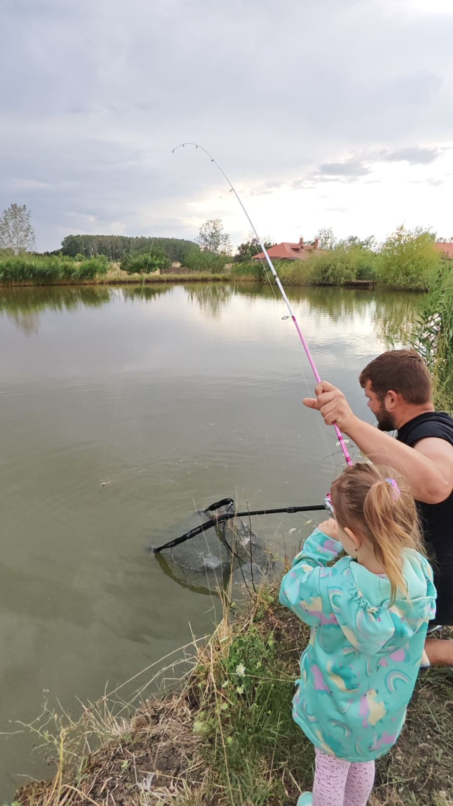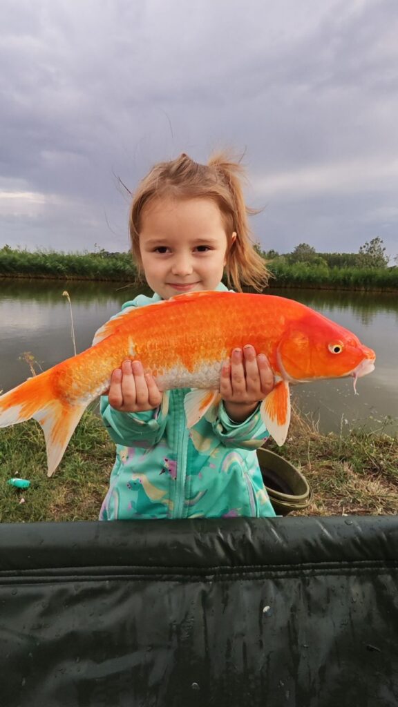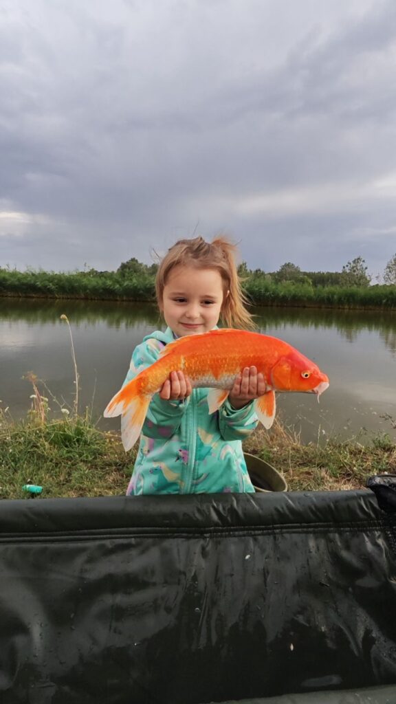 Amikor megláttuk először hogy egy gyönyörű koi pontyot sikerült neki fognia kicsit jobban segítettünk neki hiszen a hal kíméletessége is elsődleges szempont. Így apukája rátartott neki a botra. Meg is jegyezte apa nem is halat fogtam hanem egy répát.