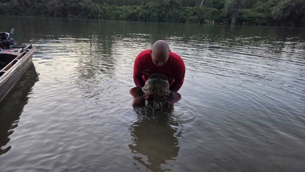 Györgyevics Tamás tapasztalt tiszai harcsás. Gyönyörű bajuszosokat fogott már, és az utóbbi időben, ha lehetősége engedi, a “kuttyogatás művészetét” űzi – láthatóan nagyon eredményesen. Nemrégiben sikerült ismét kijutnia a szőke Tiszára, és egy irdatlan harcsát akasztott, melyet az embert próbáló küzdelem után visszaengedett az öreg folyóba.